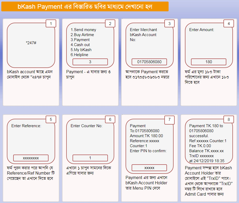 4. ফর্ম এর মূল্য আপনাকে bKash এর মাধ্যমে জমা দিতে হবে। আপনার নিজের অথবা অন্য কারো bKash Account থেকে ১৮০ টাকা ০১৭০৫৮০৬০৮০ নাম্বার এ জমা দিতে হবে। bKash এ সফল ভাবে টাকা জমা হলে আপনি একটি TrxID Number নাম্বার পাবেন। TrxID নাম্বারটি আপনাকে অবশ্যই লিখে/মনে রাখতে হবে। পরবর্তীতে Admit Card উত্তোলনের জন্য এই TrxID নাম্বারটি প্রয়োজন হবে। bKash Payment এর বিস্তারিত তথ্য ছবির মাধ্যমে দেখানো হয়েছে।
